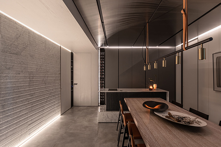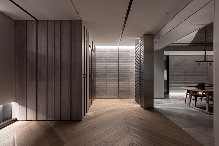 入門以帶立體紋理的卡拉拉白石材板連貫至中央餐廳主墻,魚鱗板造型的鞋柜,作為玄關(guān)與餐廳空間的中介量體。玄關(guān)的木飾面律動性的轉(zhuǎn)折延伸至客廳空間,包覆并隱藏了大型收納柜體。