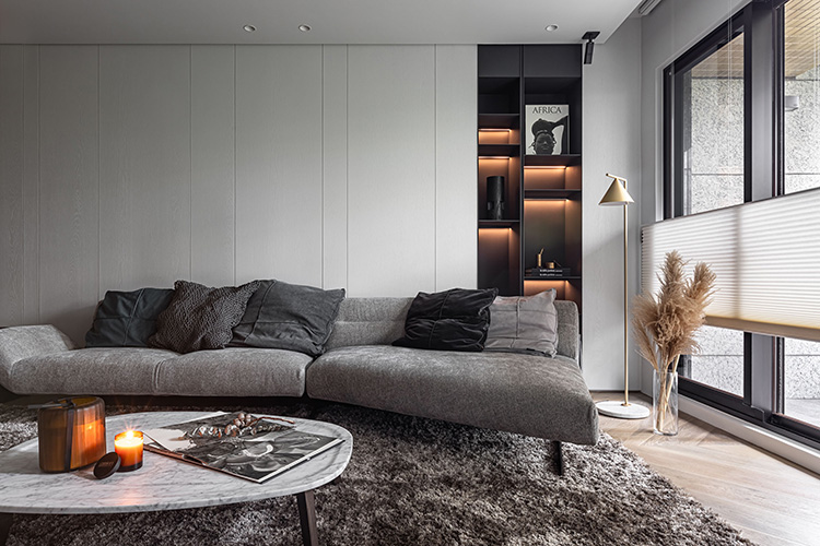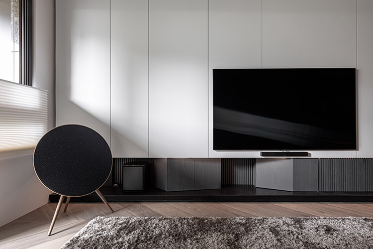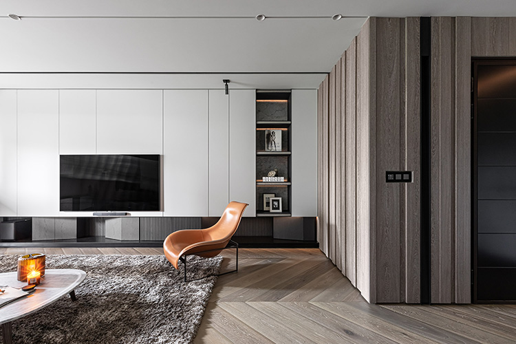 電視主墻下方收納柜的立體斜面會變化隨著時間或不同面向的光源而產(chǎn)生多變的光影對比。