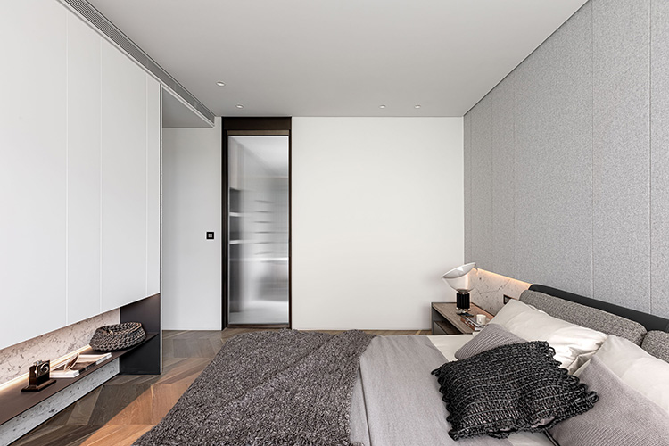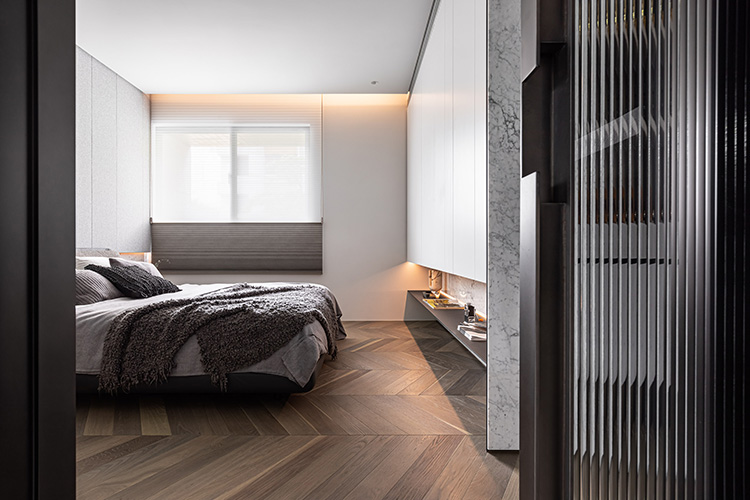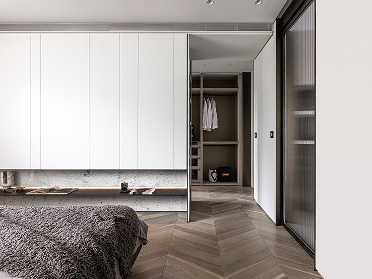 主臥入門為開放式衣帽間,一眼望穿的是二樓獨有的綠色樹梢窗景。床頭主墻簡潔的繃布分割與石材背墻,反映簡單舒適的生活調(diào)性。