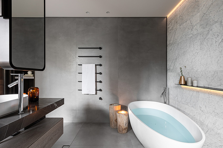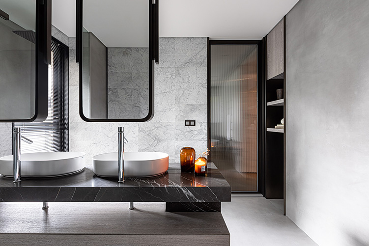 平面規(guī)畫時刻意放大的主臥衛(wèi)浴,舒適性與空間感相對提升。將西廚中島的概念引入,重新思考主臥浴室的空間配置,獨屬于這個空間的風(fēng)景。