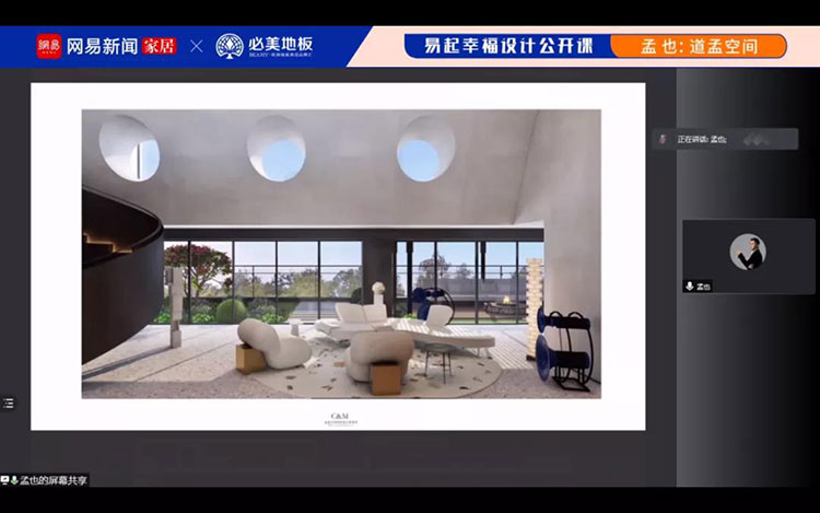 8月17日晚,由必美地板、網易家居聯合主辦的「易起幸福」設計公開課線上開講!網易家居華南主編王傅蓉擔任公開課主持人、孟也空間創意設計事務所設計總監、外WHYGARDEN家居品牌創始人孟也擔任本期公開課講師,帶來《道孟空間》系列的主題分享。作為2021幸福家室內設計大賽的評審顧問和導師,孟也也在直播間與設計師朋友們闡述最新案例項目、進行交流互動,闡述自己的設計理念、對設計產業發展趨勢的見解,以及對青年設計師的祝福和期許。