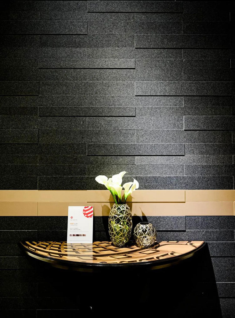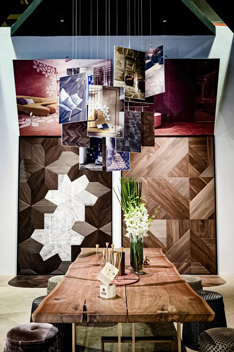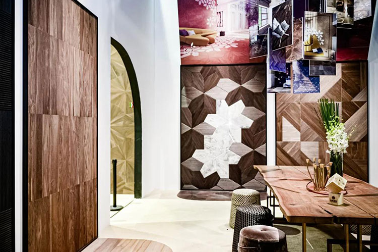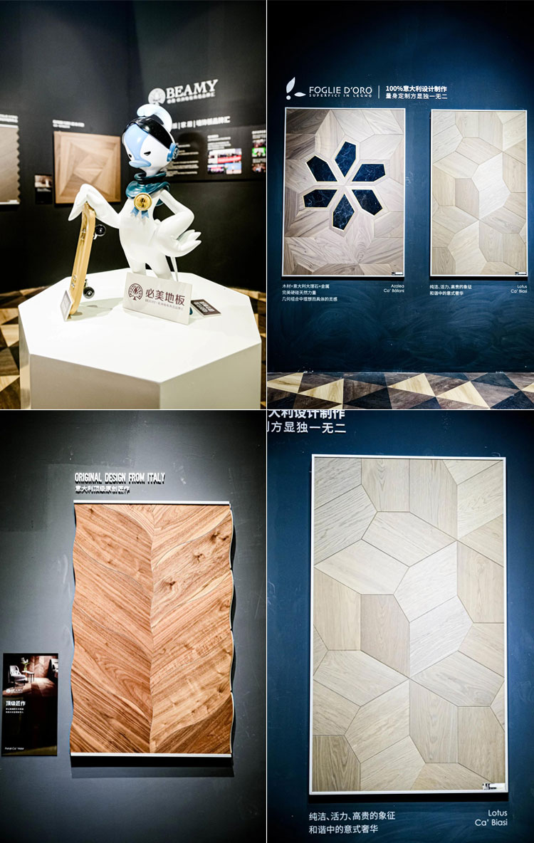 展廳論壇區造型各異的拱形門首先映入眼簾,進入后被大面積的高級黑所圍繞;地面鋪設鋪設獲得了2021紅點設計大獎的必美莫迪里奧Moods系列地板,極具濃厚的藝術氣息;意大利菲列德羅的頂級原創匠作以花朵、幾何、魚骨等賞心悅目的拼接方式驚艷觀眾眼球。