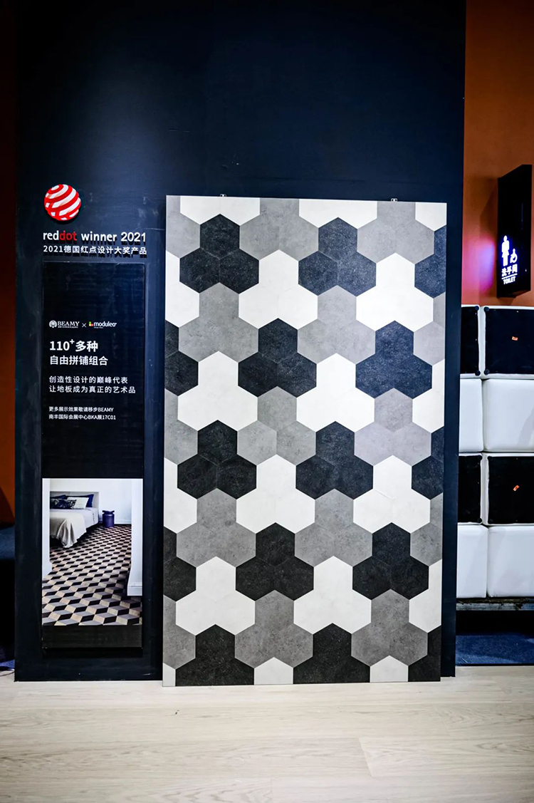 展廳論壇區造型各異的拱形門首先映入眼簾,進入后被大面積的高級黑所圍繞;地面鋪設鋪設獲得了2021紅點設計大獎的必美莫迪里奧Moods系列地板,極具濃厚的藝術氣息;意大利菲列德羅的頂級原創匠作以花朵、幾何、魚骨等賞心悅目的拼接方式驚艷觀眾眼球。