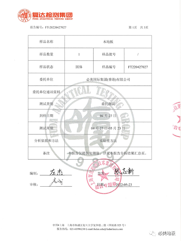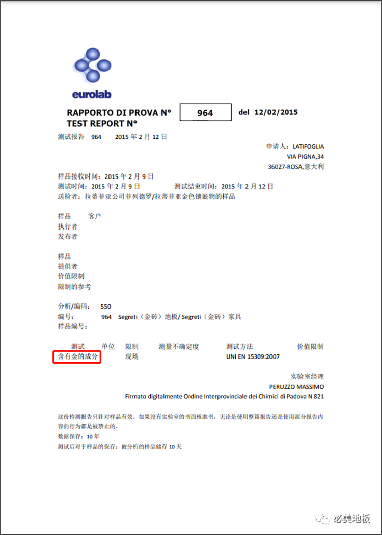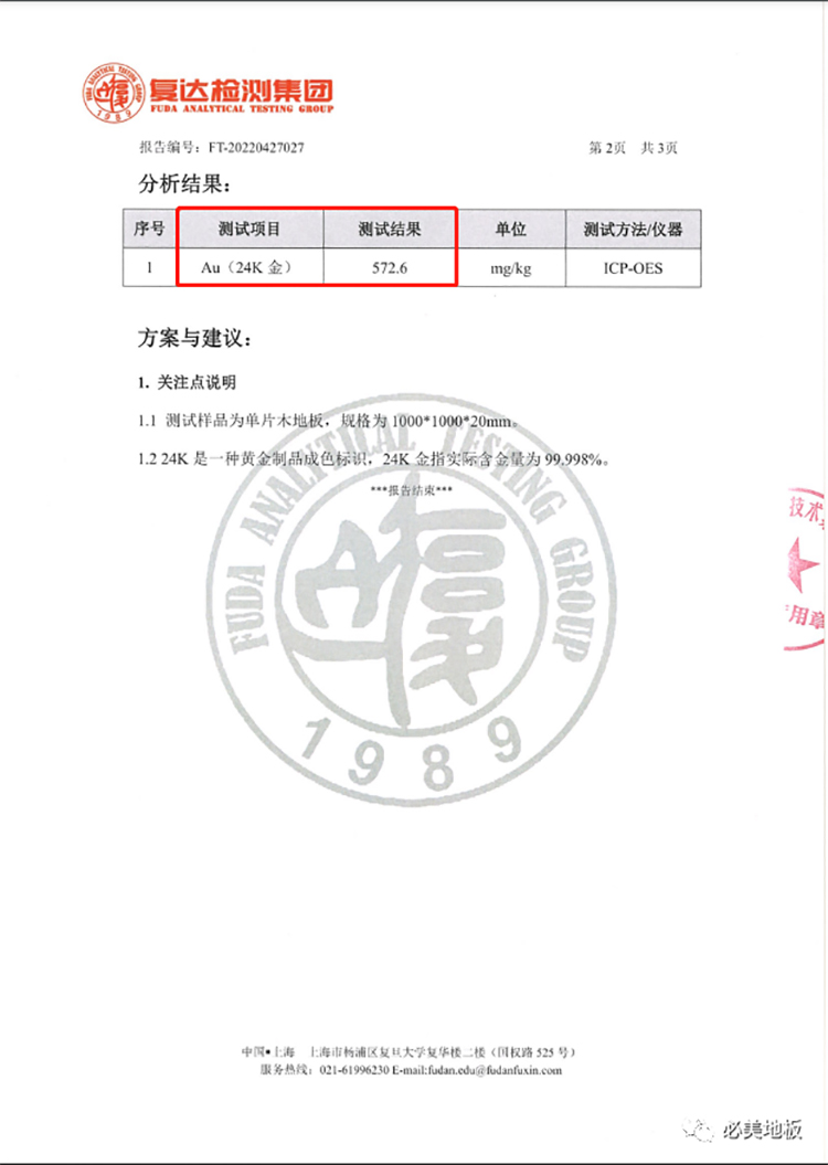 金磚地板還具有雙重“黃金身份證”,經過歐洲權威eurolab(歐洲實驗室)和國內第三方檢測機構復達檢測集團 的成分檢測,測試結果均表明必美菲列德羅金磚地板確含24k金。