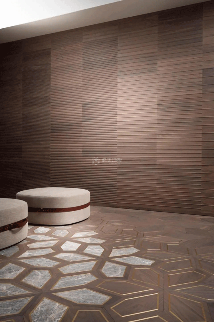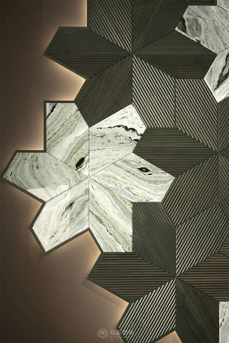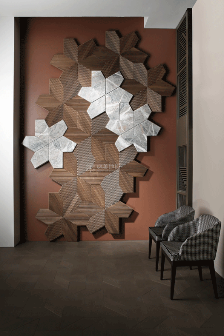 必美菲列德羅阿扎利亞的3D藝術(shù)護(hù)墻板以經(jīng)典的花瓣型拼貼方式,結(jié)合木頭與大理石/金屬條等材料元素產(chǎn)生奇妙的碰撞,全屋定制的品味與檔次,讓空間里的每個(gè)角落都充滿自然藝術(shù)的高級(jí)質(zhì)感。
