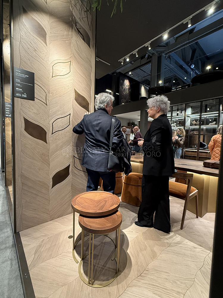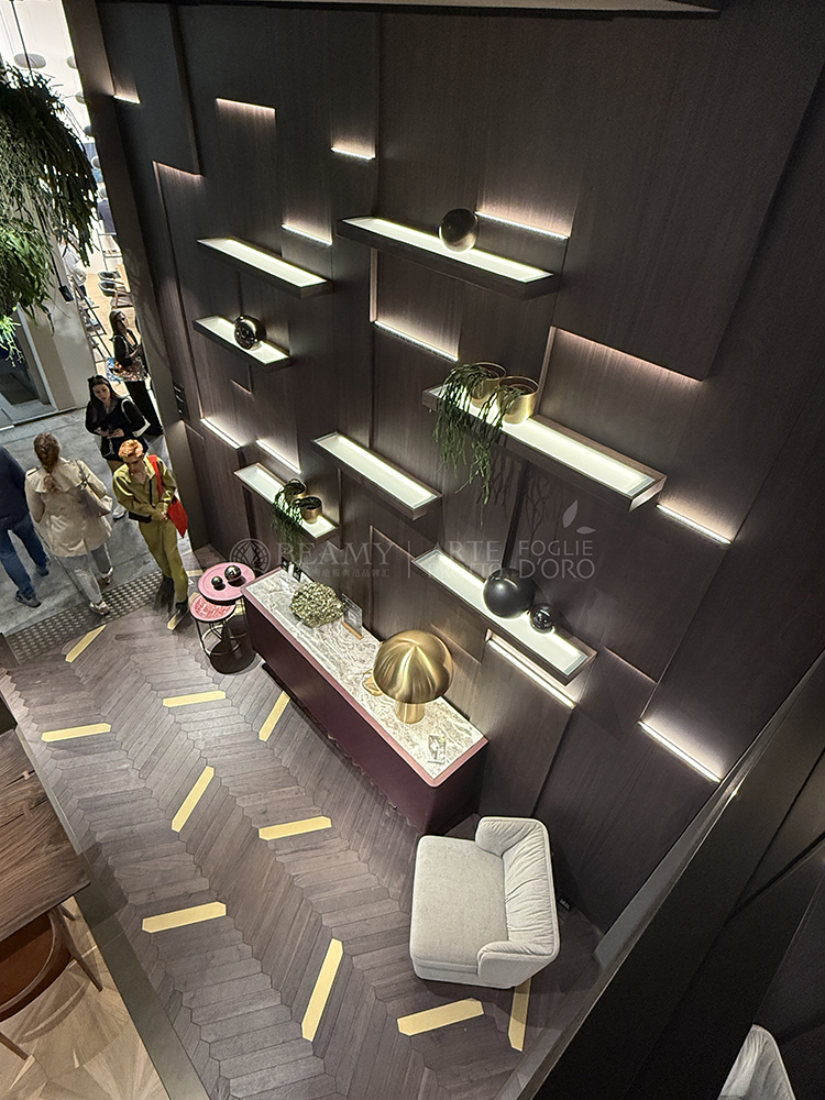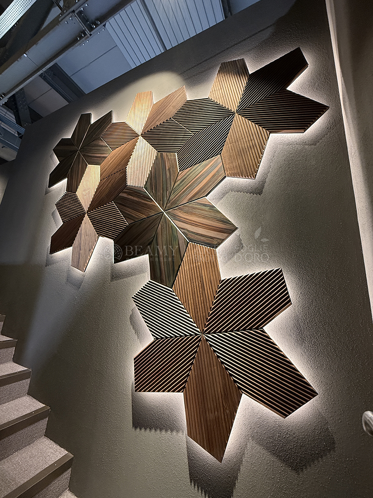 在展廳二樓部分的Azalea拼花墻板也在市場首次展示,這款特殊的效果是金屬經過氧化而成的,3D立體的視覺效果,邊緣有特別的V槽設計,結合了全新的鋼材元素,5毫米厚的金屬將鋼材的V槽延伸過渡到了木質的部分,是由必美菲列德羅獨家發明的產品。