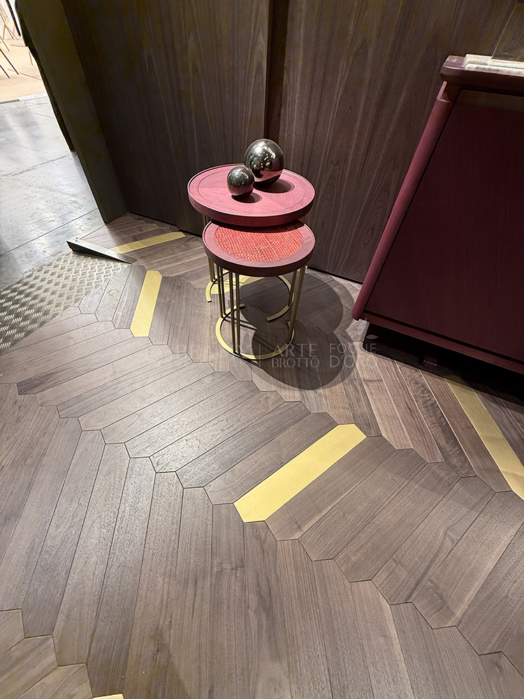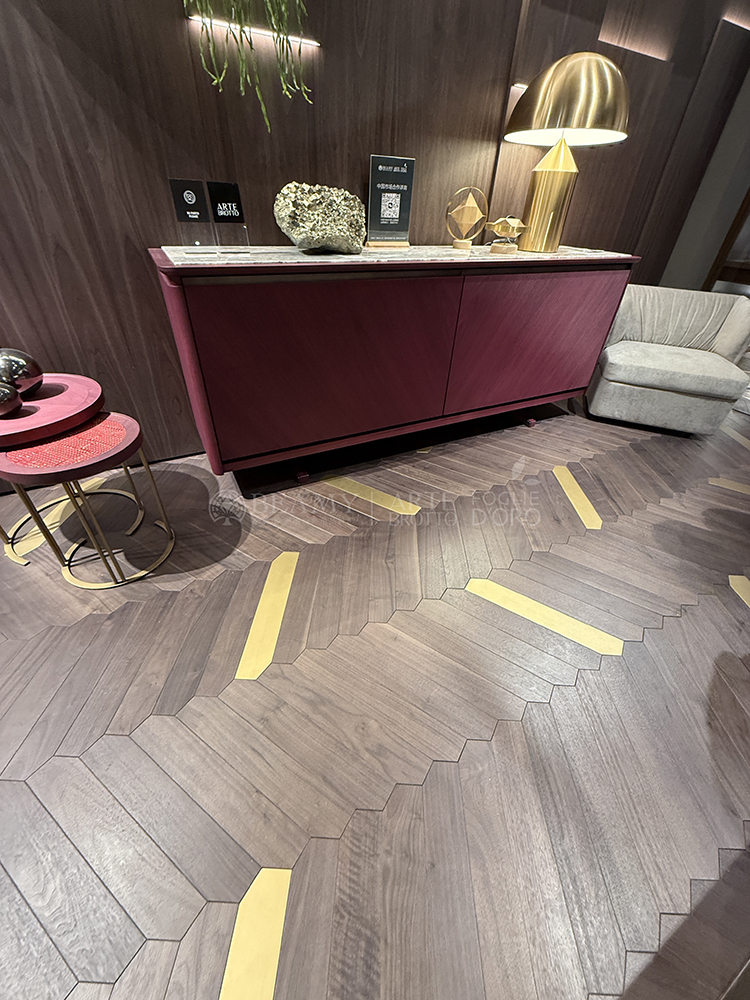 這款全新推出的Azalea拼花地板使用了一款橡木的顏色搭配了黃銅的線條以及奢石的鑲嵌,Travertino Titanio是來自意大利的奢石,經過特殊處理做成了啞光的飾面,為家庭空間賦予了非常高端的效果。