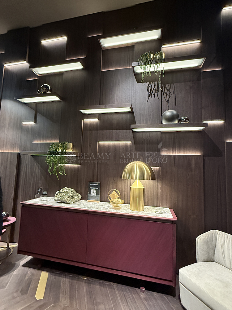 “通過黃銅顏色和木材顏色相結合,卡塞爾瓦花色的胡桃木加入幾片黃銅顏色作為點綴與墻上這款翠貝卡墻板相呼應。”