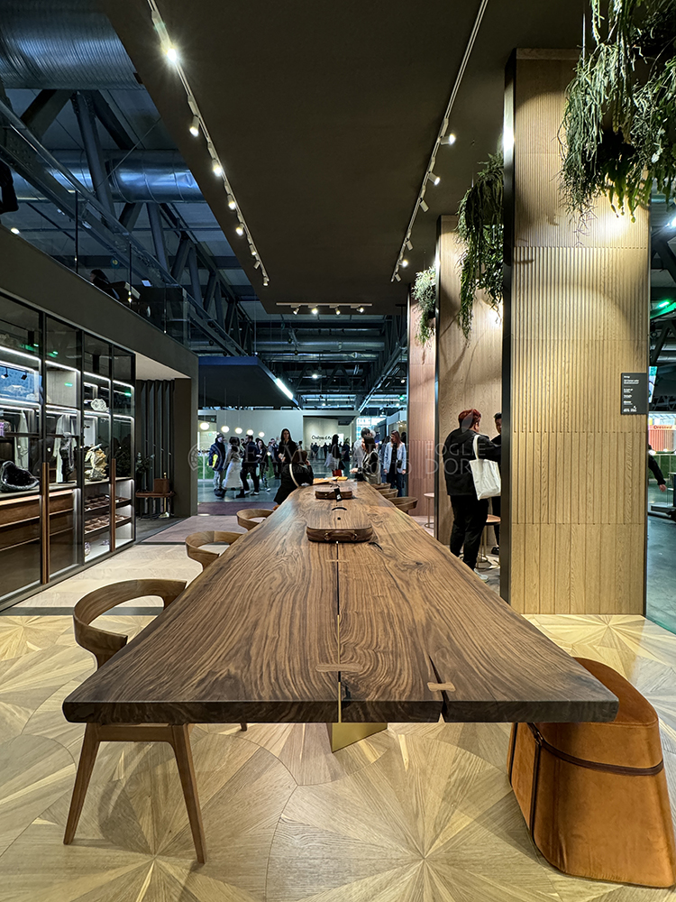 這是全展廳最受矚目、重點展出的展品之一,選用生長周期長達300多年的胡桃木為原料,桌子長達5米4,保留了樹干本身的自然輪廓以及板面上的自然特性。