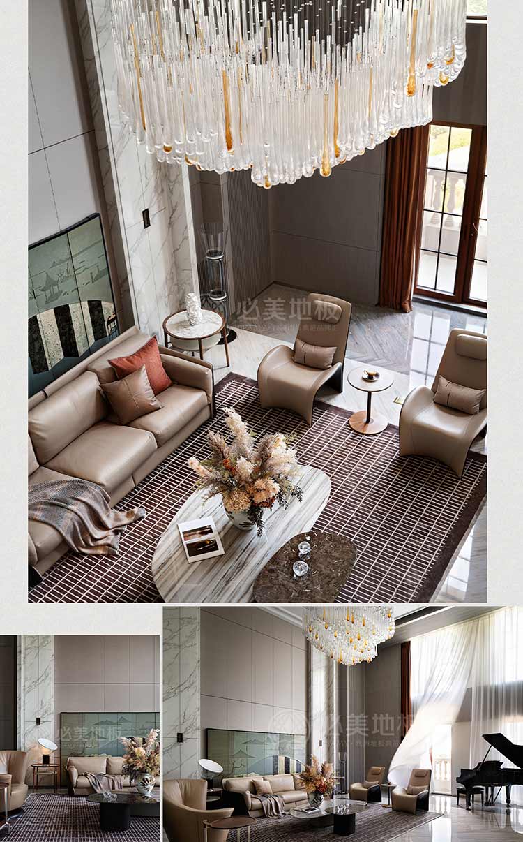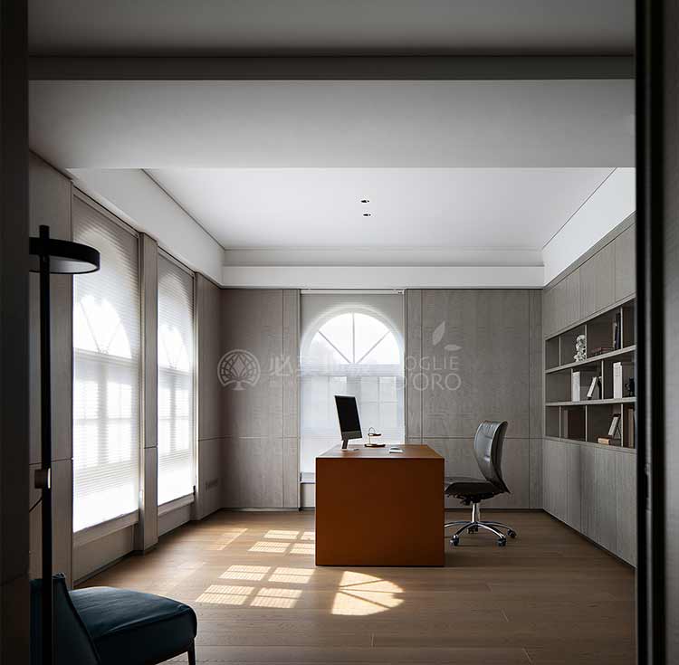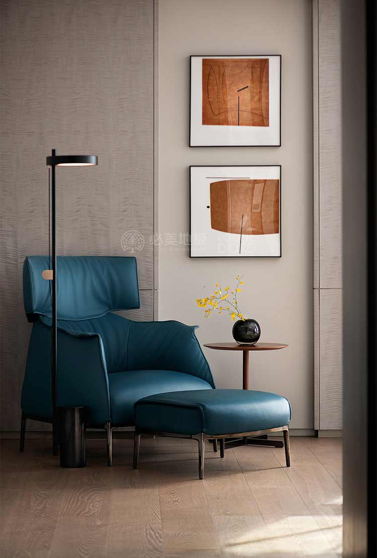 設計在休憩空間更為克制,整體質感的體現通過細節的雕琢來呈現。大面的低飽和設色,給人以靜謐放松的空間感受;張弛有度的線條浸入其中,詮釋居住的美學范式;奢適的尺度容納生活需求,大開窗將光與景的變化全盤收藏。無論是從美學還是功能角度來看,必美菲列德羅巴塞吉奧木地板都是這個空間不可或缺的一部分。