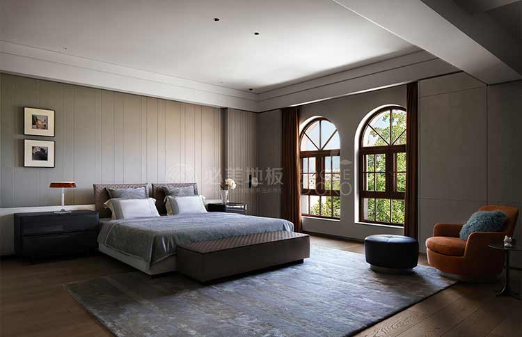 地板以其優雅的橡木紋理和獨特的淡色調完美地融合了現代簡約與自然元素,營造出一種溫馨而寧靜的氛圍,搭配上灰色的墻壁和現代家具,進一步增強了房間的現代感和舒適感,使臥室成為了一個完美的休息和放松之所。