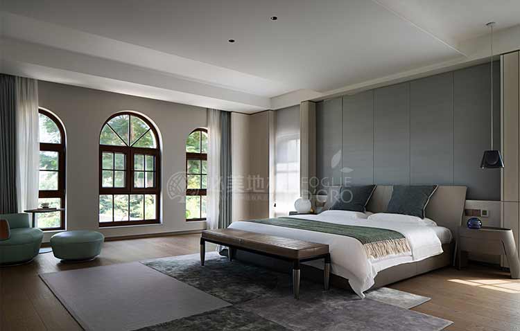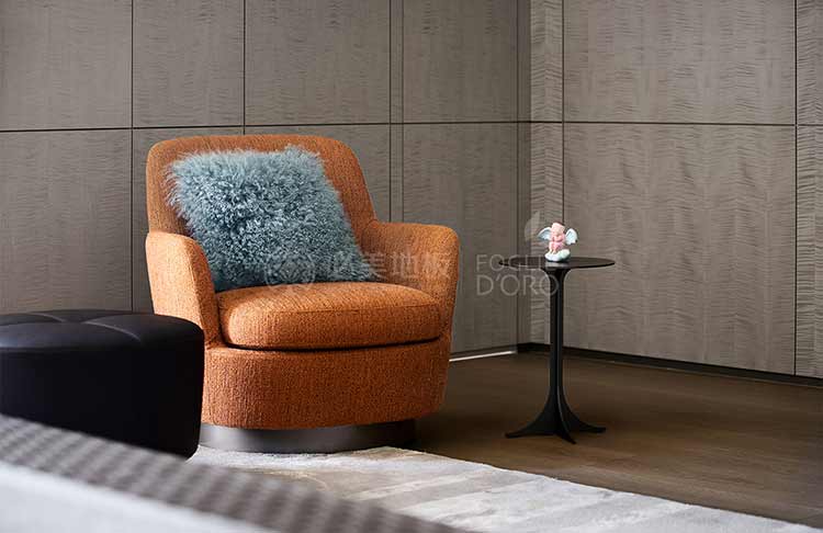 基于空間場景的整體打造,臥室的功能不僅僅考慮居住功能,設計希望臥室也可以像酒店套房一樣成為可以自在休憩的空間。在這間臥室的設計中,必美菲列德羅巴塞吉奧橡木地板成為整個空間的焦點。