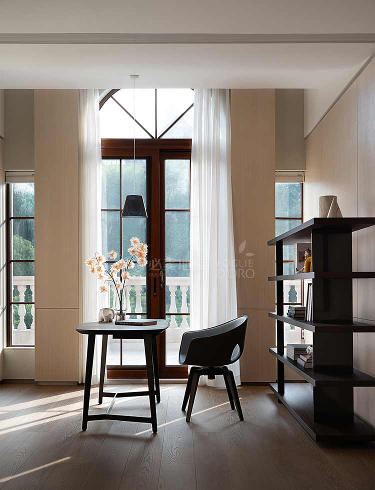大面的開窗讓光影自在描摹,空間的每一寸充滿生機,陽光透過窗戶灑在地板上,形成美麗的光影效果,進一步增強了空間的層次感和視覺吸引力,讓居者在每一次心靈對話中找到寧靜和幸福。