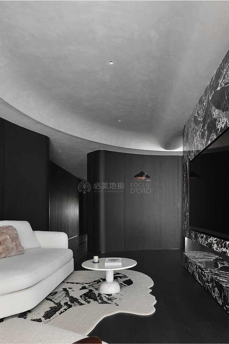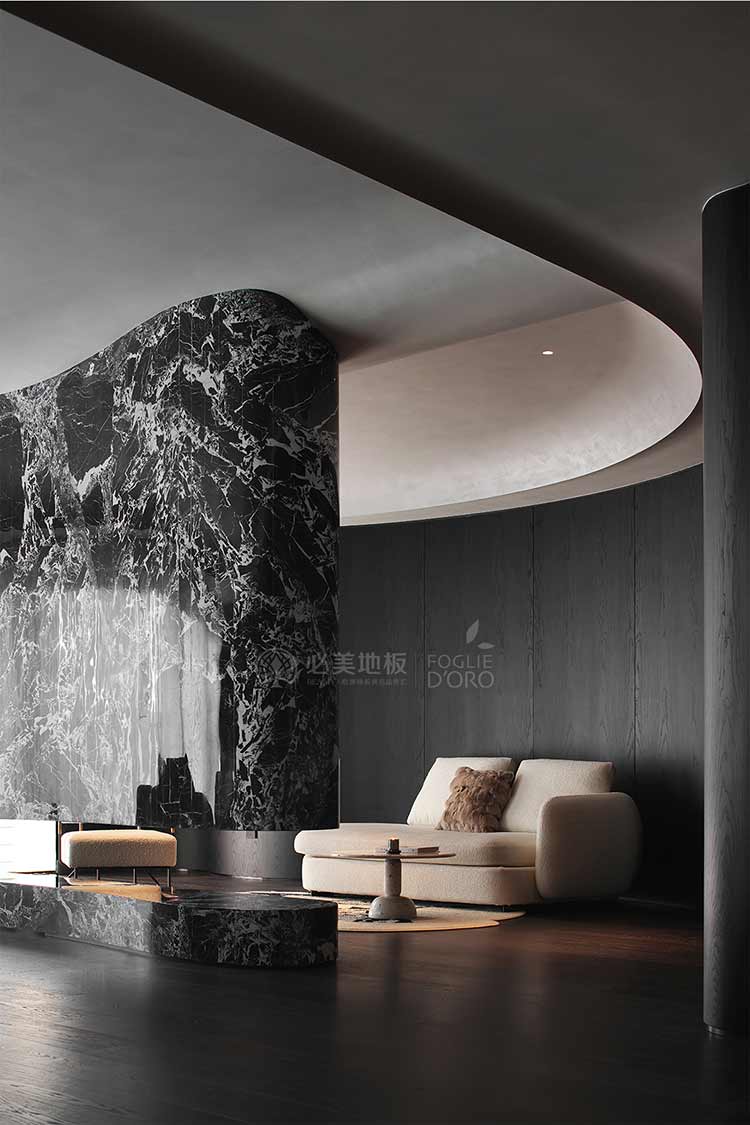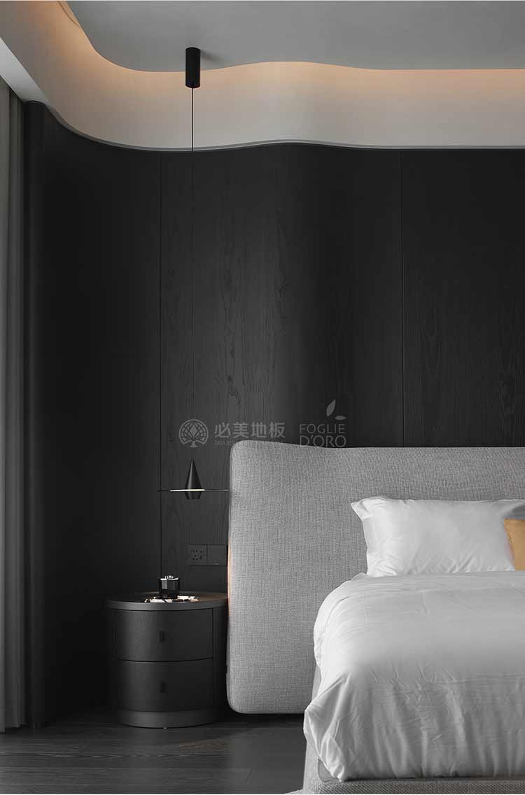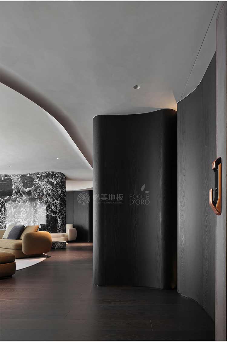 整個空間的視覺調性偏深邃的質感暗調,從軟裝、墻面家具陳設到地板,視覺達到了極度的高頻統一。必美菲列德羅皮薩尼橡木地板是通過手工雕刻、清漆染色,增加了木材的自然特性,讓空間通過光與材質肌理的關系,明暗色彩的有效點綴,藝術家具化的主調形式,表達出空間的和諧與純粹感。