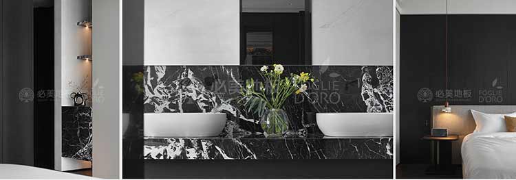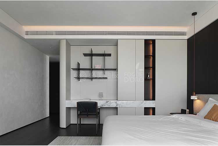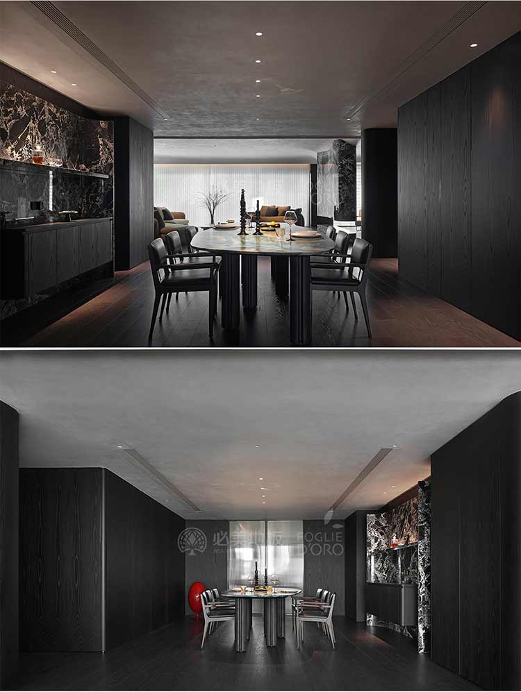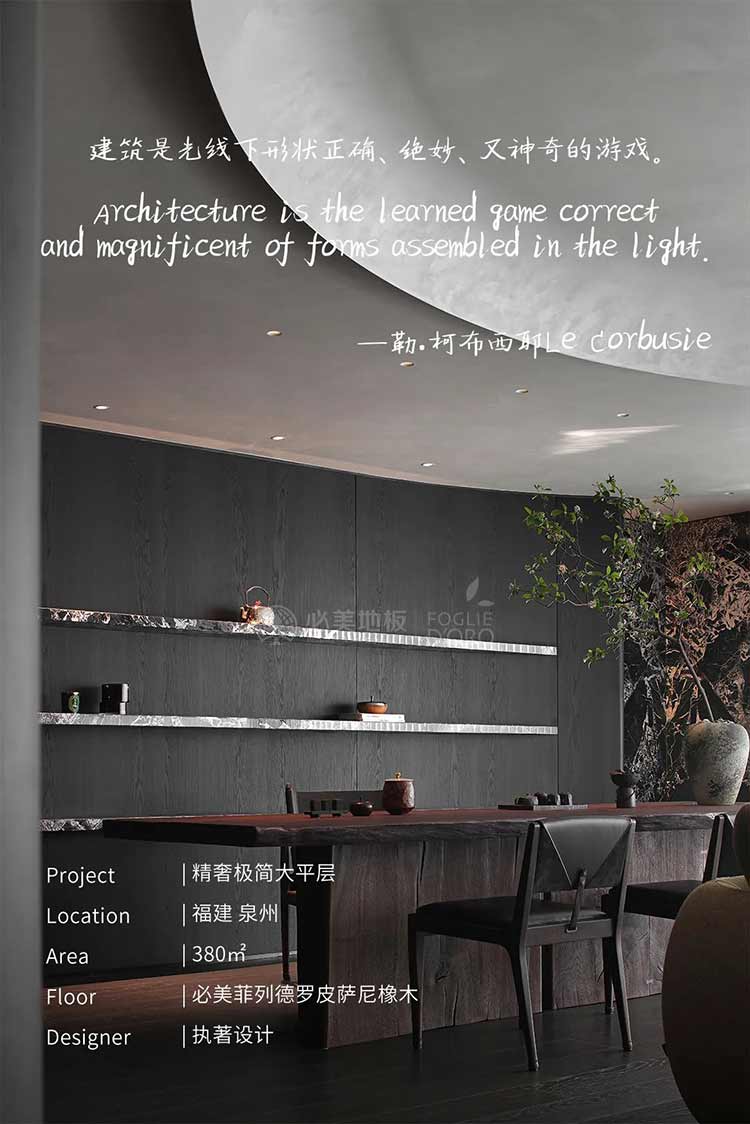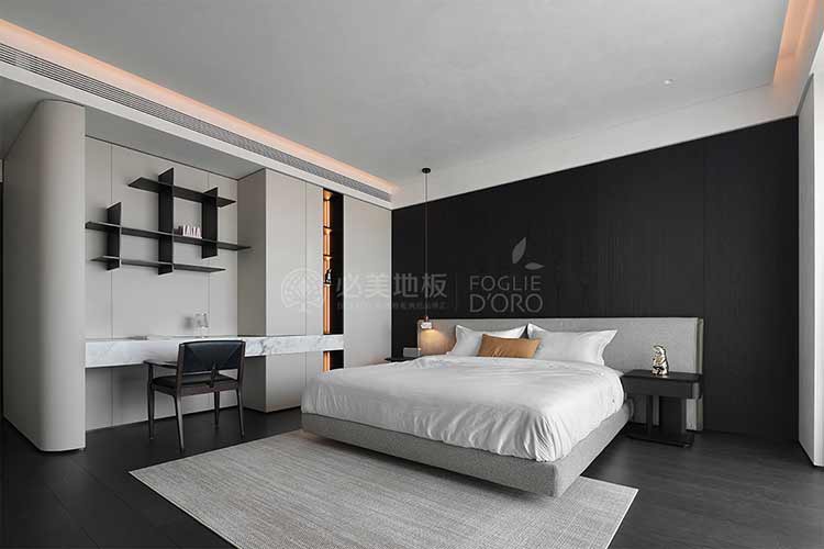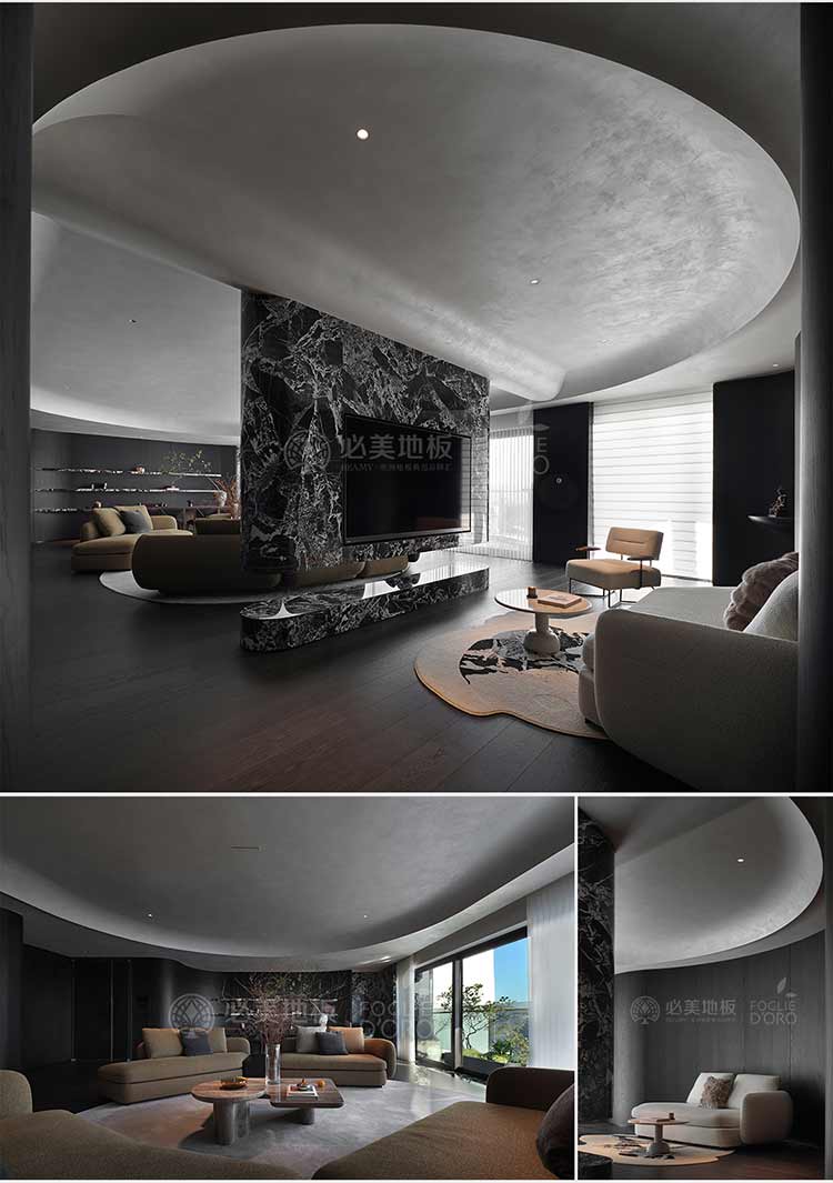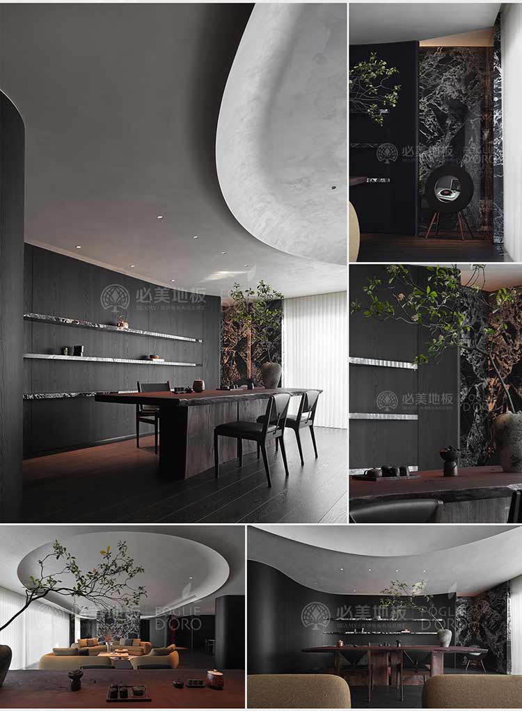 整個空間的視覺調性偏深邃的質感暗調,從軟裝、墻面家具陳設到地板,視覺達到了極度的高頻統一。必美菲列德羅皮薩尼橡木地板是通過手工雕刻、清漆染色,增加了木材的自然特性,讓空間通過光與材質肌理的關系,明暗色彩的有效點綴,藝術家具化的主調形式,表達出空間的和諧與純粹感。