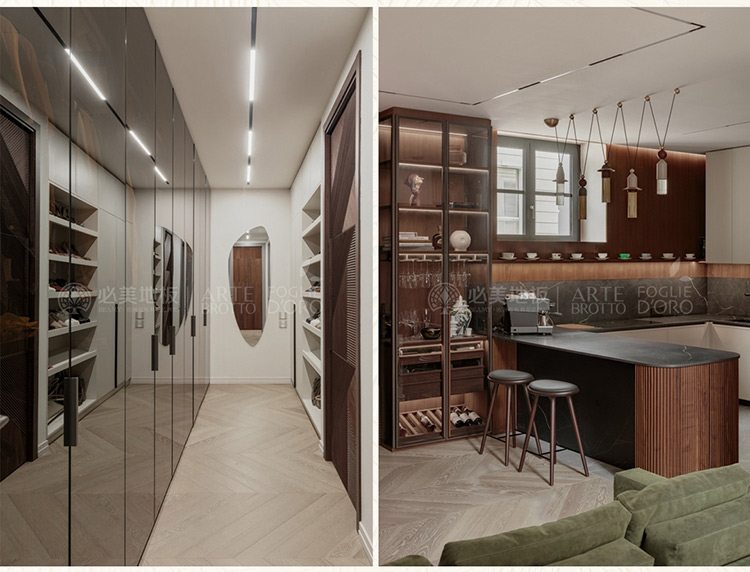 必美阿特·布魯托提供的定制解決方案還包括走廊上的華麗衣柜,采用Noce Oliato飾面,Noce Oliata配有尤加利木Grigio Perla門和把手,Noce Oliato的酒窖展示柜,采用Terra飾面和煙熏玻璃結構,在循序漸進的藝術美學中,筑就空間一體化系統化格調。