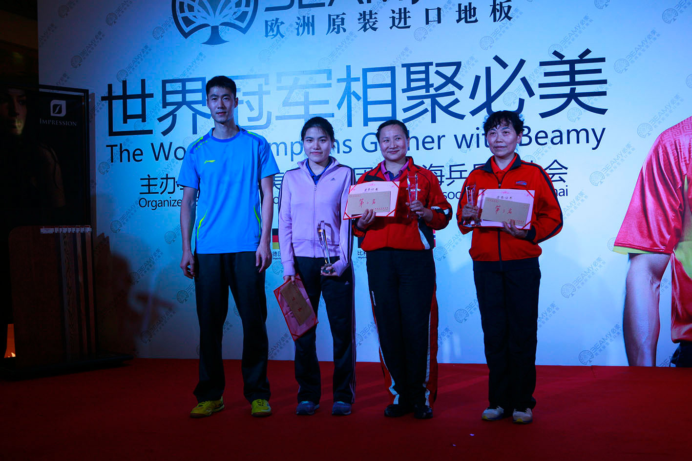 采訪過后,兩位世界冠軍施拉格先生與王勵勤先生分別為我們民間挑戰賽的前三名選手頒獎,上海市乒乓球協會主席陳一平先生為我們參與比賽的選手們頒發參與紀念獎。